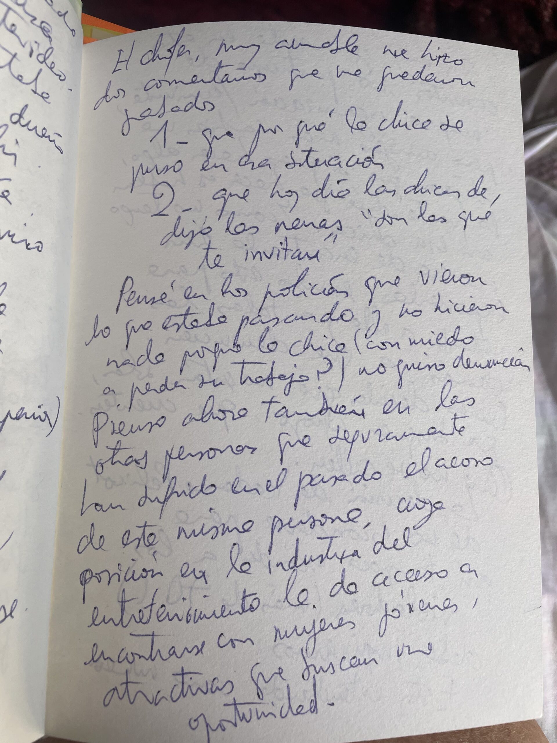 Soy muy ignorante en estos asuntos; no participo de ninguna organización feminista. Pero amigas más sabias me dijeron que si quiero hacer algo, lo que tendría que hacer es hablar con esa chica y, como no tengo manera de encontrarla sin exponerla, escribo esto para instarla a ella y a todas las demás a que denuncien. Quiero decirles que no están solas, que busquen apoyo, que cuenten, que no se callen.